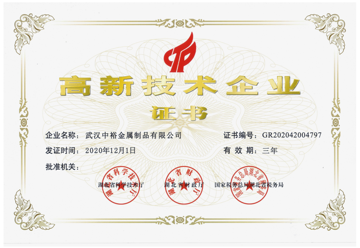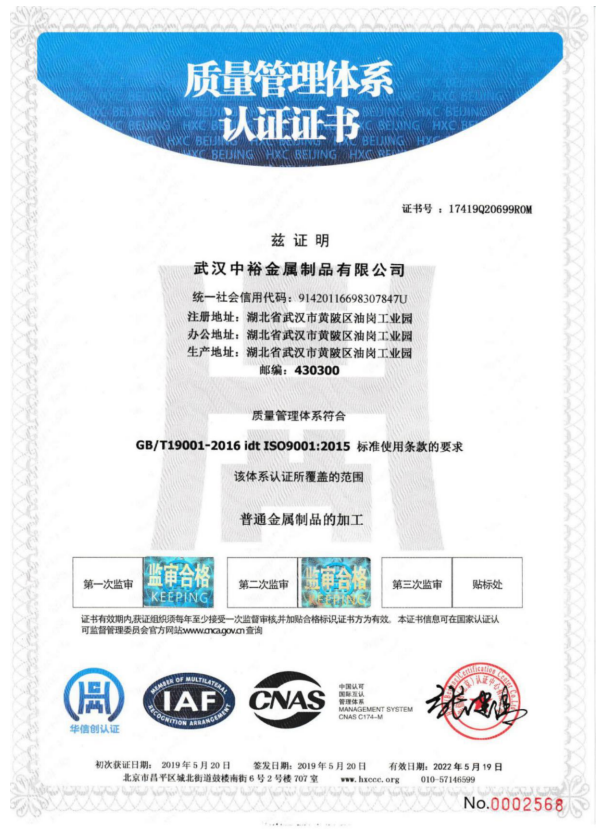 武漢中裕金屬制品有限公司(以下簡稱公司)成立于1996年8月,民營私人獨資企業(yè)。2010年8月投資1800余萬元,在前川油崗工業(yè)園征地20畝,新建5000平方米的生產車間和1100平方米的辦公大樓,2011年8月全部峻工投入使用。